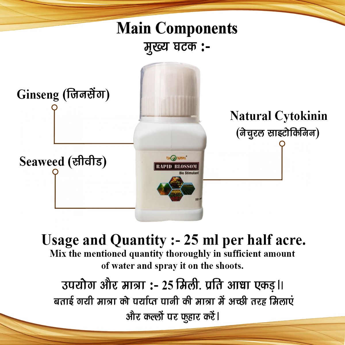 Biowell “Rapid Blossom” is a nutrient-rich growth stimulator and metabolism booster. It is helpful in increasing the number of flowers in the crop, protecting it from falling and maturing the crop uniformally. It promotes cell division, maintains color, weight and luster of fruits. It increases the number of branches / tillers, buds and shoots, and increases the ratio of flower to fruit formation in the crop. It protects the plant from adverse conditions like water logging, cold and high temperature etc. Its use is very useful for all types of cereals, oilseeds, and vegetable crops.