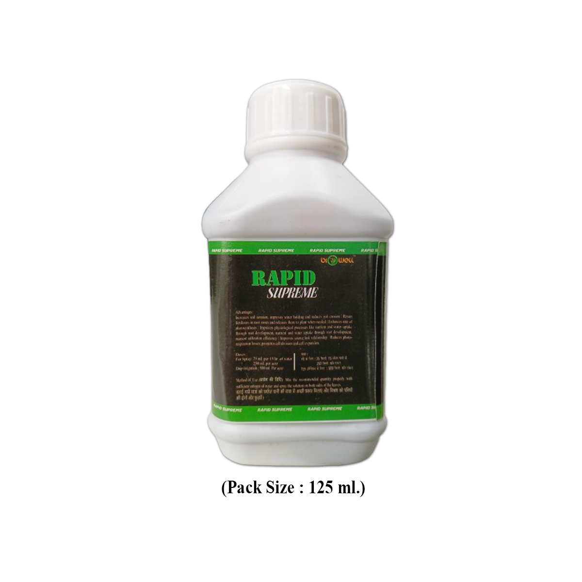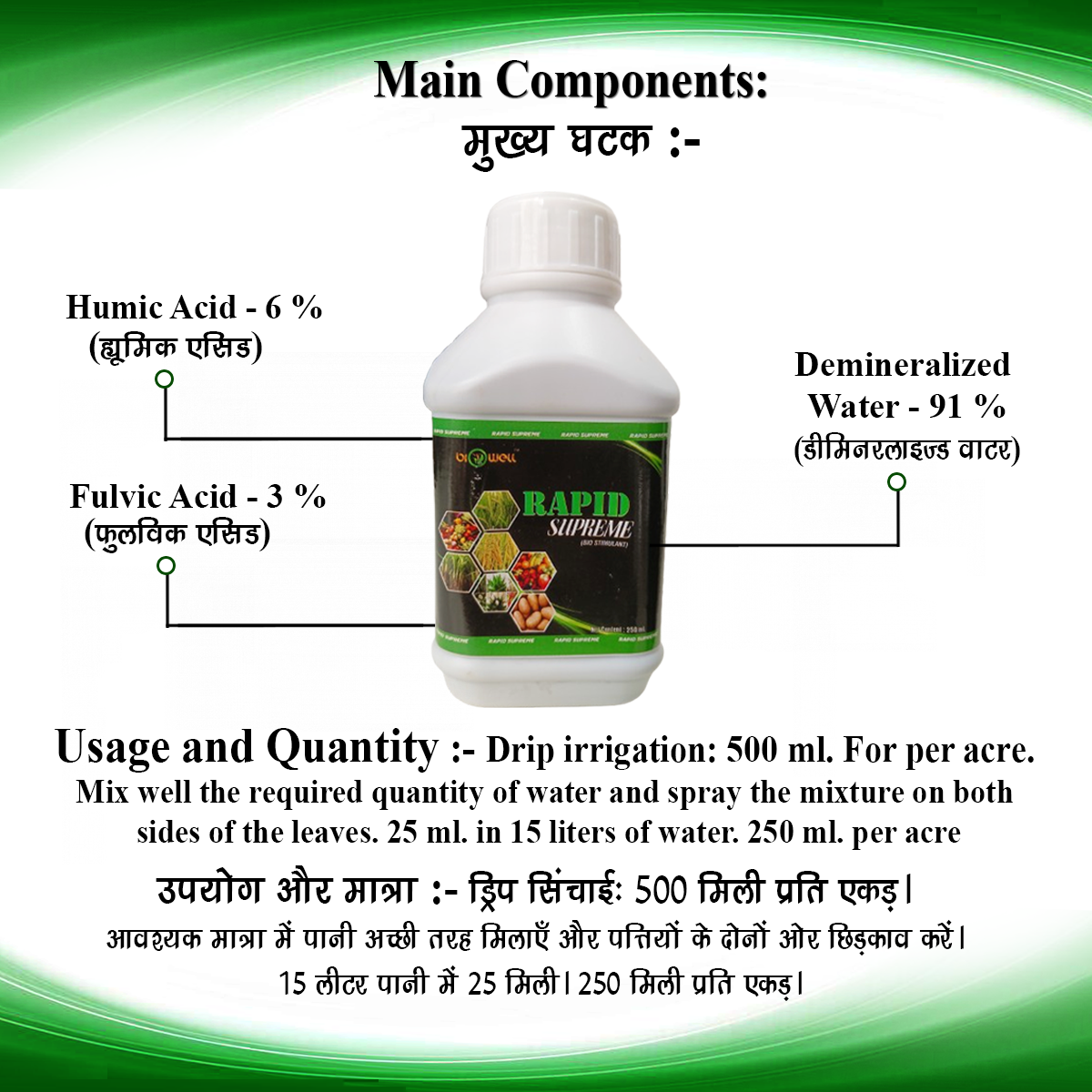 Drip irrigation: 500 ml. For per acre. Mix well the required quantity of water and spray the mixture on both sides of the leaves. 25 ml. in 15 liters of water. 250 ml. per acre