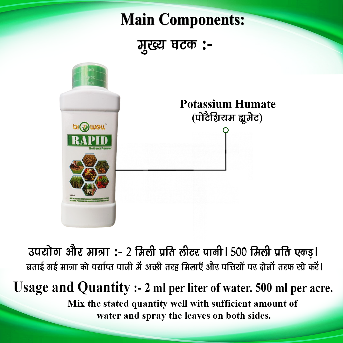 In order to give a new dimension to the poison-free farming campaign, Biowell has brought to you... Completely Organic Product in a very reasonable price ------ "Rapid the Growth Promoter". Rapid is one such product in the field of agriculture whose regular use will increase the fertility of our land.